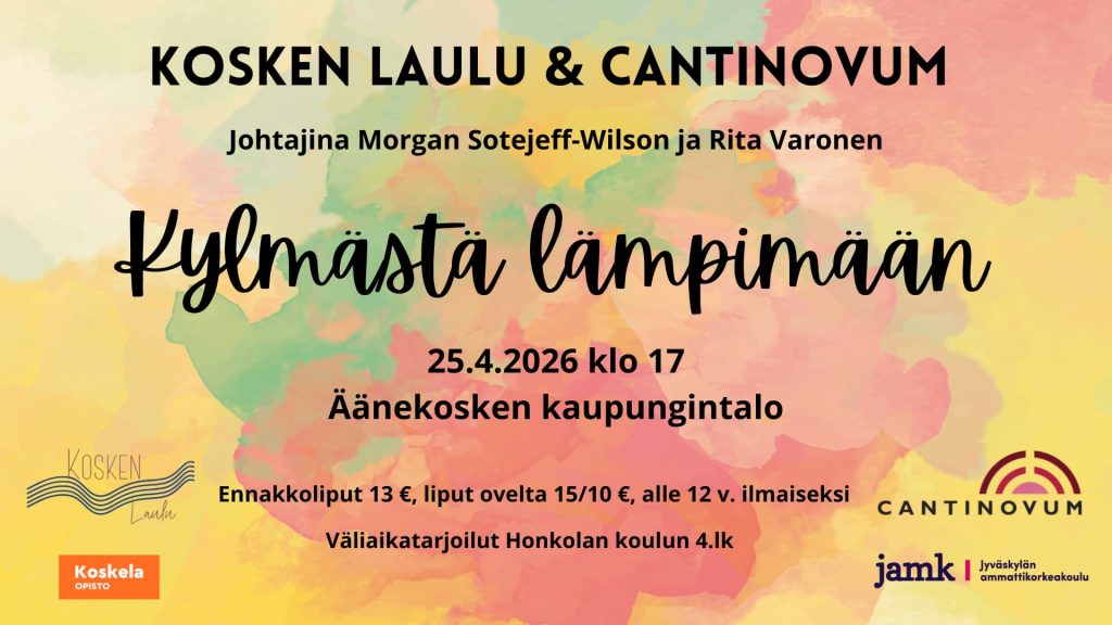 Kosken laulu and Cantinovum are joining forces to sing in a joined concert at Äänekoski 25.4. at 17:00. Concert includes Intermediate break, which Delicacies are presented by school of Honkola:s 4th grade class.